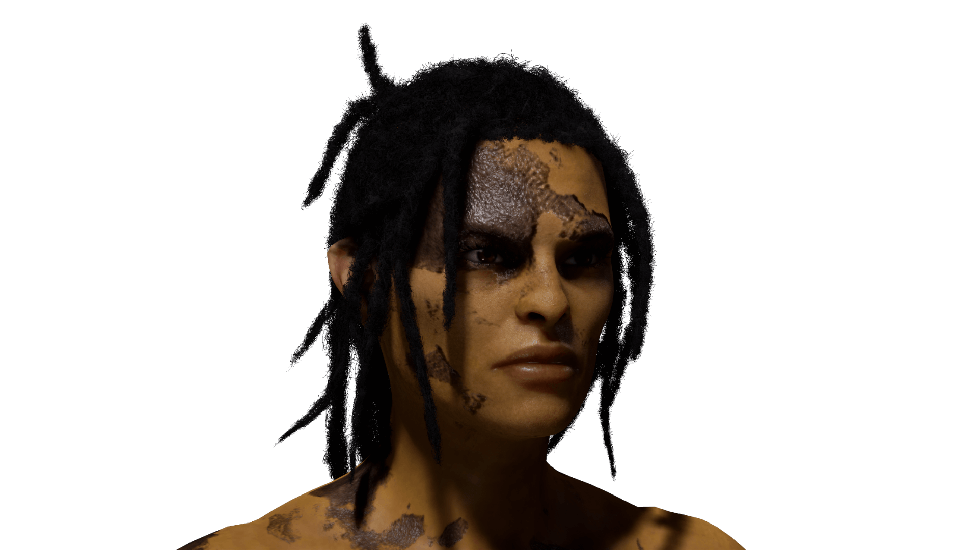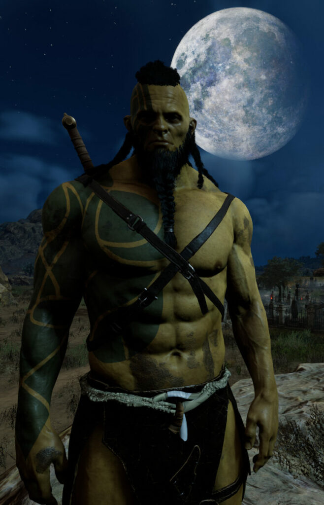 On most Thursars markings will appear on different parts of the body. On full blood orcs these markings are related to age and social status, but on Thursars this function is lost. Thursars have thicker hair than humans but in general have less body hair. Their eyes are often completely dark yellow, dark brown or black, it is extremely rare to see a half orc with a bright human-like iris. They have good vision even in faint light although they can’t see in total darkness, but this comes at the expense of a slightly poorer color vision. Thursars also have a good sense of hearing compared to humans, but they have difficulty hearing higher frequencies.
