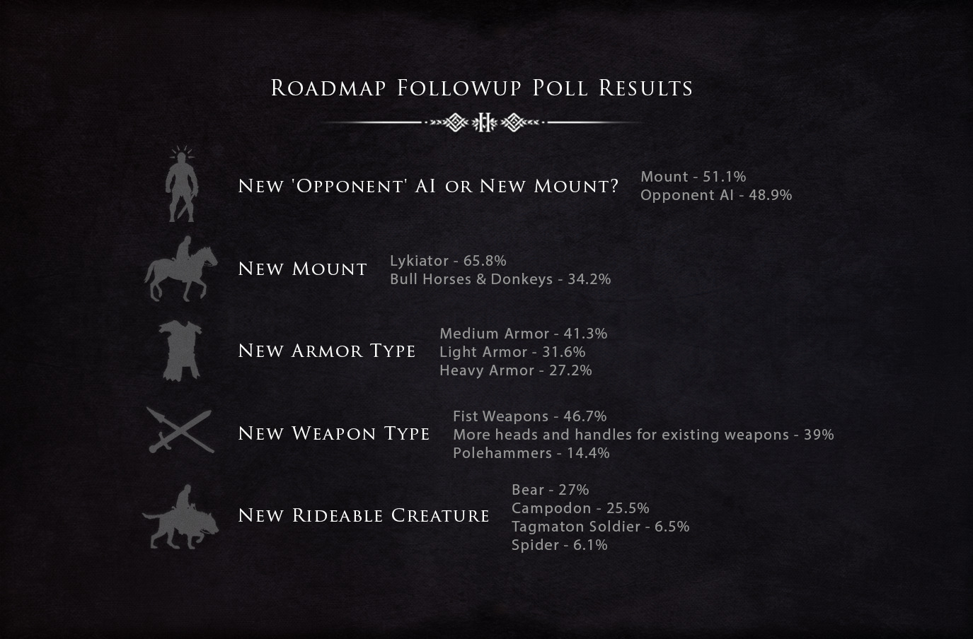 After our first Community Roadmap poll, we asked you to help us narrow down some specifics of some of the top voted items, such as for the ‘New Creature’, whether or not you would like to see a new “Opponent” AI you can fight, or a new dedicated mount instead, as well as which class the new armor set should be in, Light, Medium or Heavy.