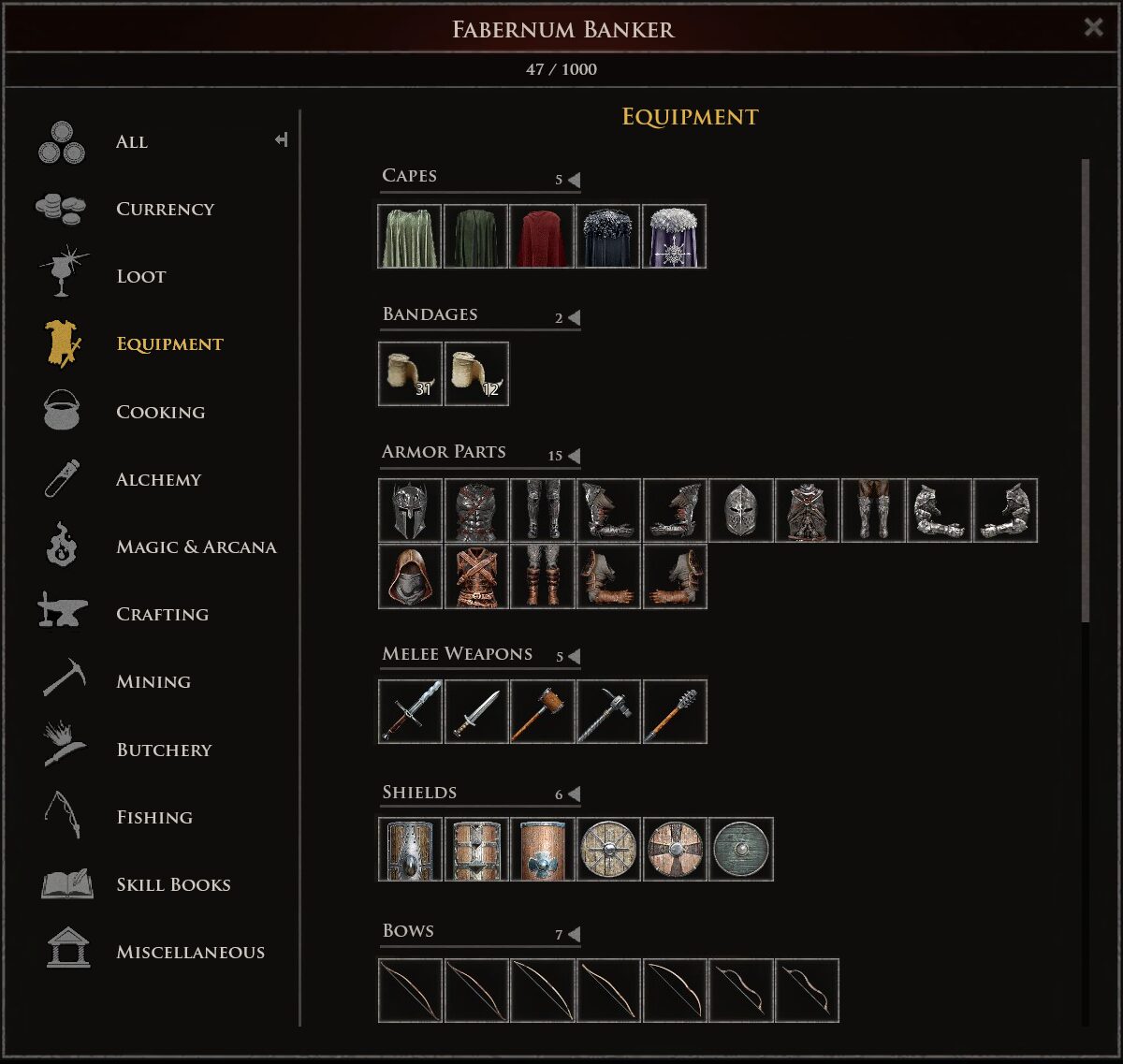To aid with this, we are experimenting with the idea of creating “Favored” item sets which after being set up, could be withdrawn with a single click to your inventory. An example use case for this might be a set of specific magic reagents of a specific quantity, or a specific set of armor pieces.